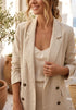 Blazer largo de manga larga con solapa, confeccionado en tela ligera y caída fluida, ideal para clima cálido. Corte recto. Cuenta con cuatro botones en contraste de color en la parte frontal, que al abrocharse hacen que el cierre sea cruzado.