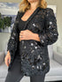 Blazer elegante de solapa con estampado y lentejuela largo con encaje. Corre justo a su talla.