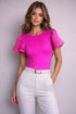 Body de manga corta, confeccionado en tela que se ajusta al cuerpo resaltando la silueta. Presenta cuello redondo que aporta un estilo limpio. Sus mangas cortas con doble volante añaden un toque delicado y femenino, creando movimiento y volumen en los hombros. Tiene broches en la parte final para abrochar. La tela estira muy poco. Corre muy justo.