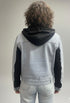 Chamarra corta de mezclilla ligera con tela de sudadera. Cierre frontal completo de cremallera metálica. Dos bolsillos en el pecho con solapa y botón metálico. Y cuenta con bolsillos a los costados. Detalle de bordes deshilachados sobre los bolsillos y en las uniones de las mangas. Capucha integrada de tela negra ajustable con cordones delgados. La mitad de las mangas es de tela tipo sudadera. La espalda es completamente de mezclilla. Acabado con una pretina en la base que incluye trabillas para cinturón.