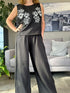 Set de 2 piezas blusa de cuello redondo con botón en espalda alta, y dobladillos en borde de manga, pantalón amplio con resorte en cintura pinzas y bolsillos delanteros. Corre en su talla.